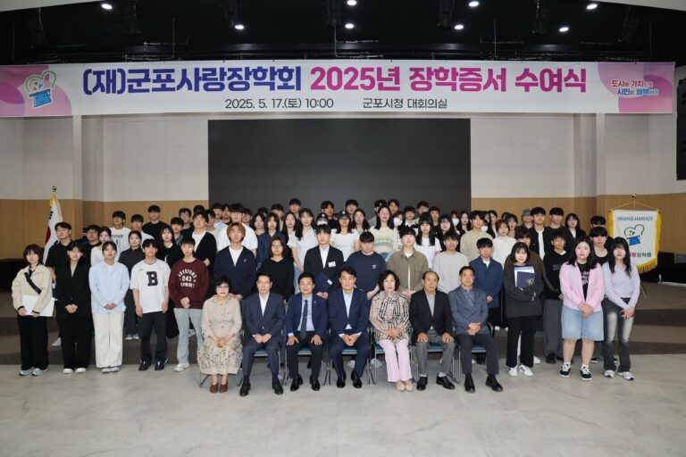 지난 5월 17일 토요일 오전 10시 군포시청 대회의실에서 (재)군포사랑장학회 2025년 장학증서 수여식이 진행됐다. 수여식은 하은호 군포시장, 김성철 장학회 이사장 등이 참석한 가운데 장학생으로 선발된 고등학생 66명, 대학생 156명 등 총 222명의 학생들에게 장학증서가전달됐다.