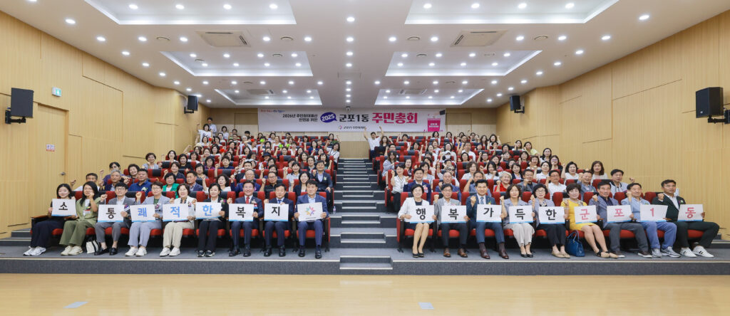 군포시 군포1동 주민자치회(회장 김사녀)는 9월 2일(화) 군포새마을금고 대강당에서 ‘2025년 군포1동 주민총회’를 성황리에 개최했다고 밝혔다.  이날 총회에는 하은호 군포시장, 김귀근 군포시의회 의장을 비롯한 도·시의원과 시민 등 200여 명이 참석해 마을사업 추진 방향을 공유하고 내년도 사업 의제를 결정하는 시간을 가졌다.
