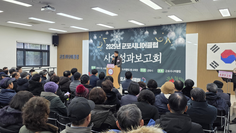 군포시니어클럽(관장 김종철)은 12월 23일(화요일) 군포시니어클럽 대강당에서 하은호 군포시장, 김귀근 군포시의회 의장 및 시의원 등 주요 내빈과 노인일자리 참여자 170여명이 참석한 가운데, 성과보고회를 개최했다.