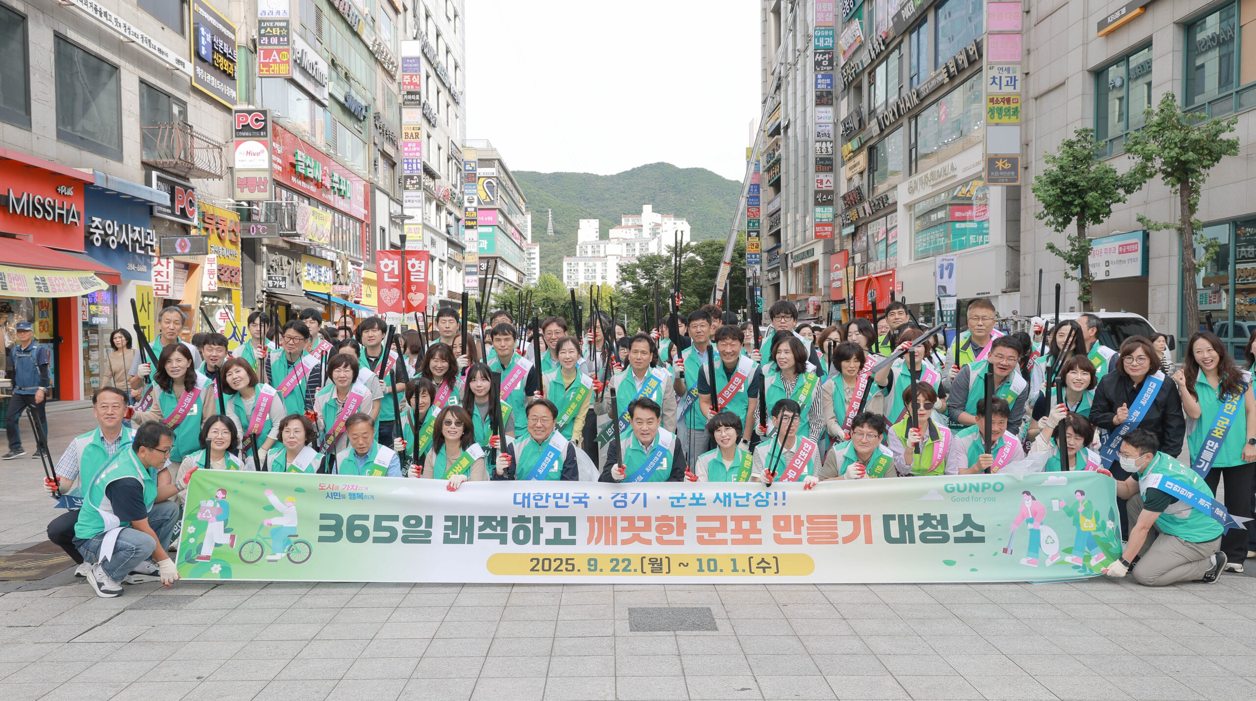 군포시는 추석 명절과 2025 APEC 정상회의를 앞두고 도시 미관 개선과 쾌적한 생활환경 조성을 위한 ‘대한민국 새단장’ 캠페인의 일환으로 산본로데오거리 일대 대청소를 실시했다. 이번 대청소는 9월 22일 월요일 오전 9시부터 한...