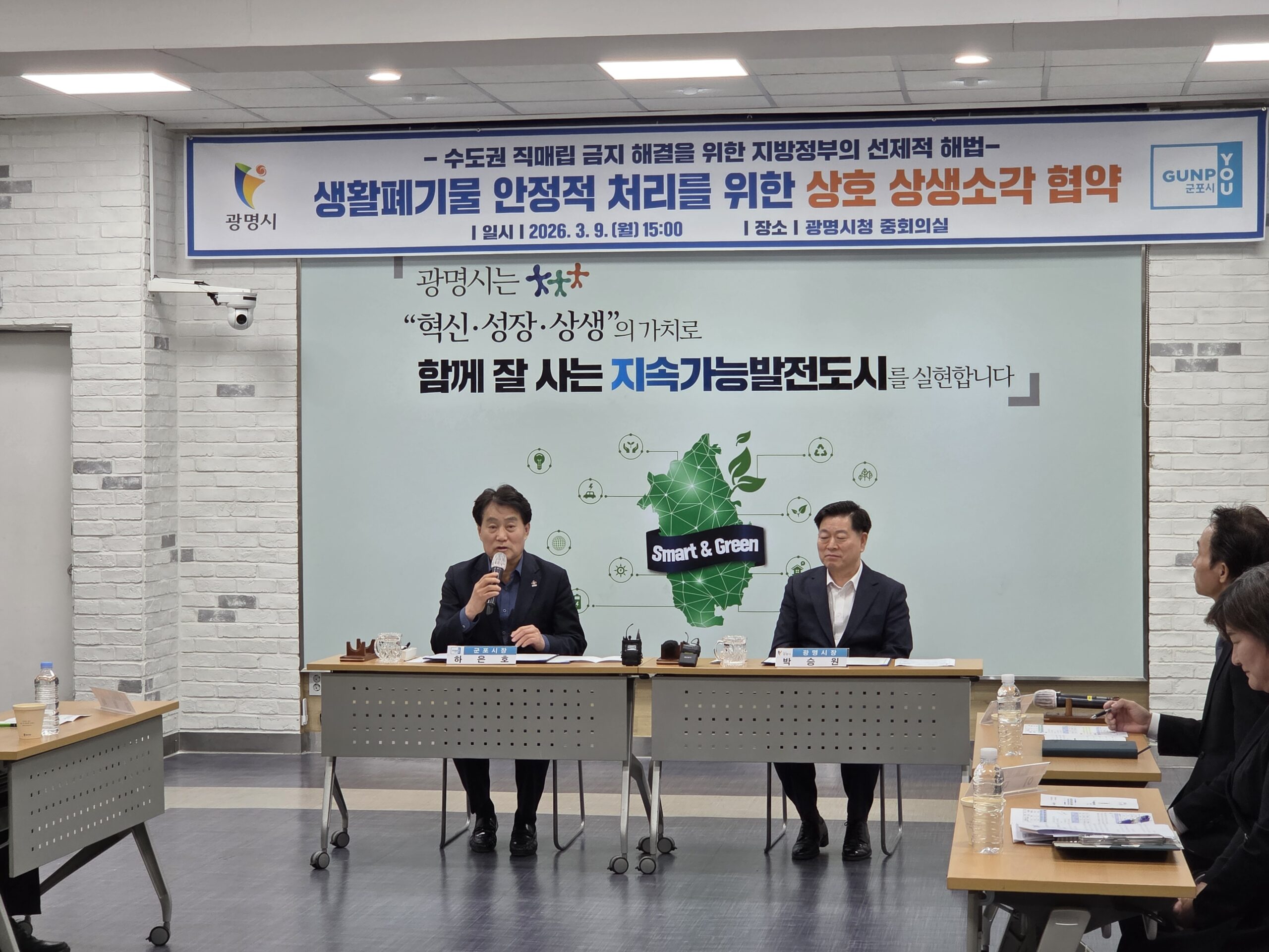 군포시(시장 하은호)가 광명시(시장 박승원)와 손잡고 전국 최초로 수도권 기초지자체 간 생활폐기물 소각시설 공동이용을 통한 상생형 자원순환 협력모델을 시행한다. 3월 9일 양 시는 업무협약을 체결하고, 각 소각시설의 정기 보수기간 동안 상대...